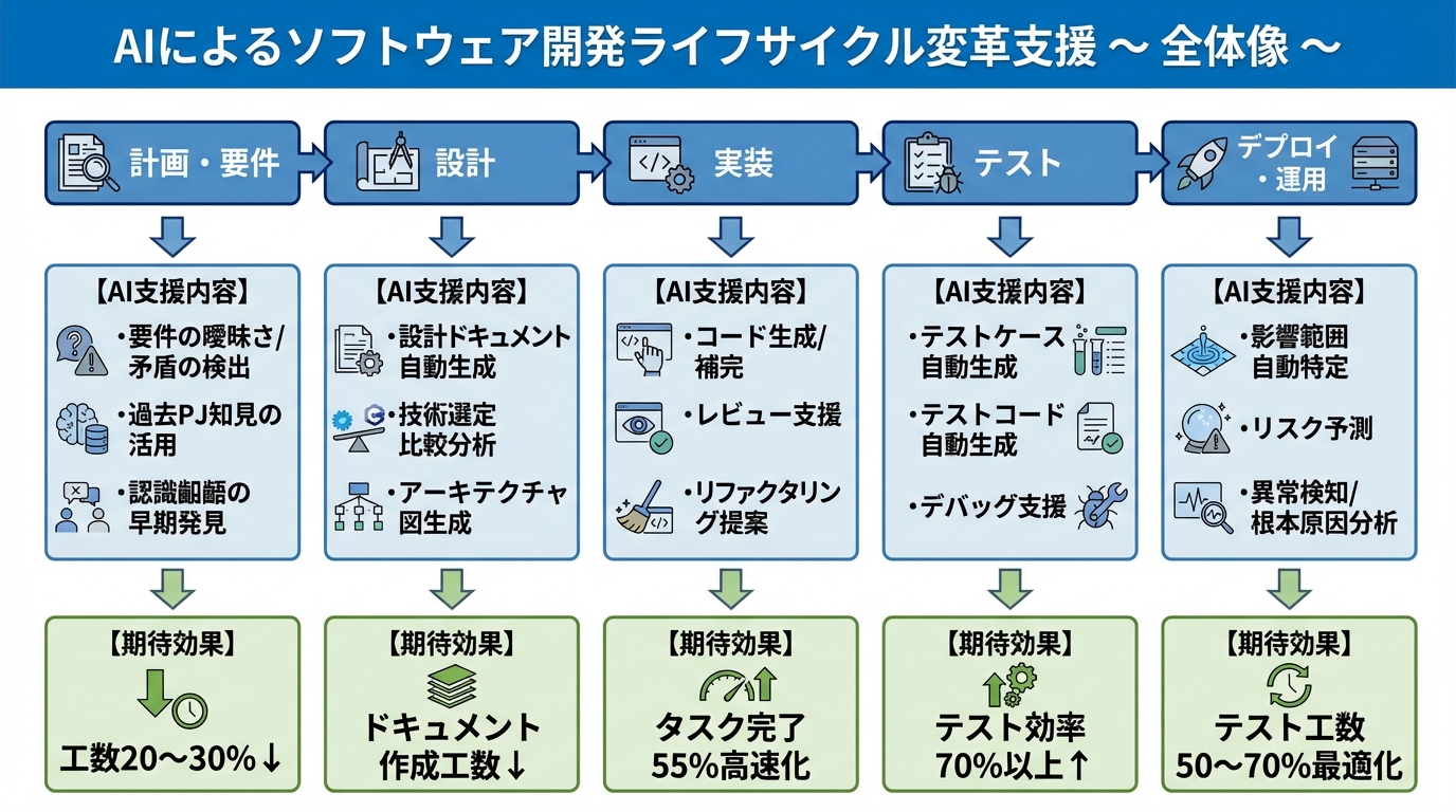 ライフサイクル全体をAIが支援。AIがドラフト作成・実行、人間が監督・品質保証。