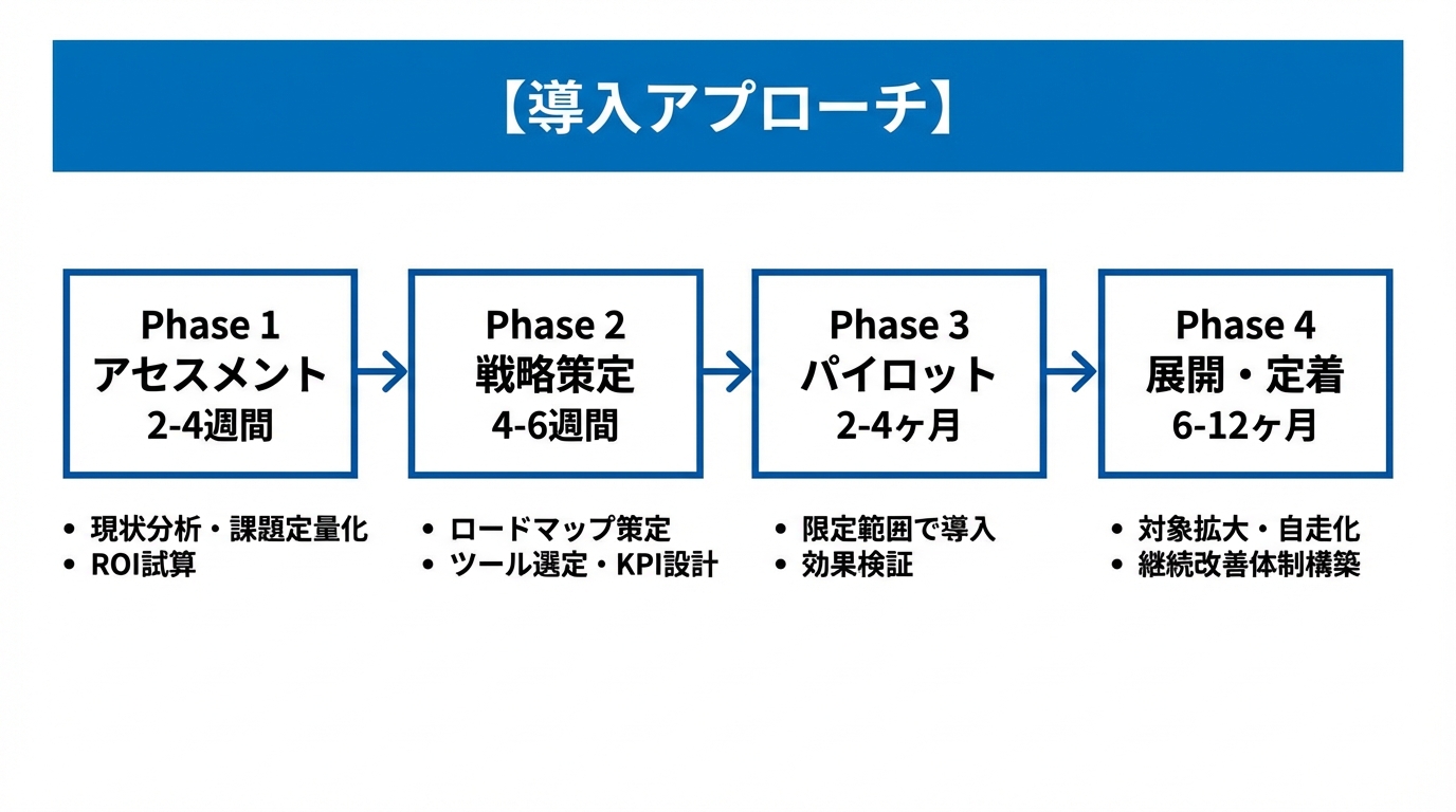 AIを開発プロセスに導入する際、一気に全面展開しようとすると、現場の混乱や期待はずれの結果を招きがちです。 当社では、段階的なアプローチを推奨しています。まず現状を正確に把握し、小さな成功体験を積み重ねながら、 徐々に適用範囲を広げていく。このやり方が、最終的には最も確実に成果につながります。